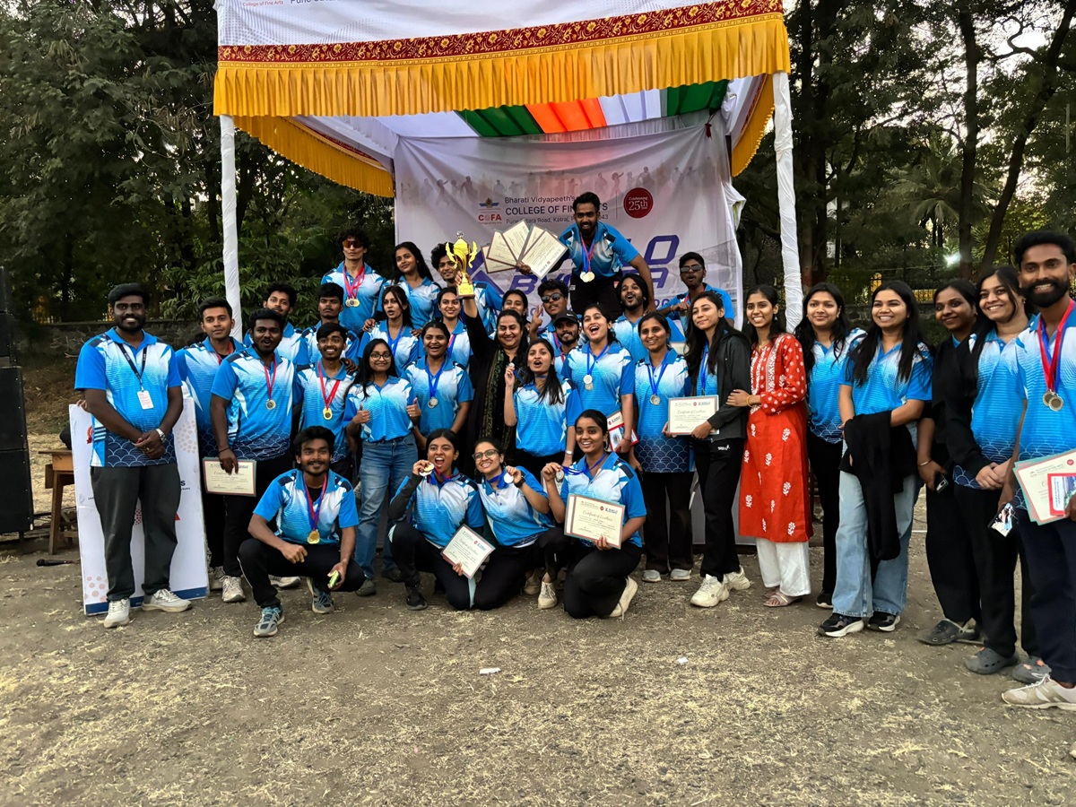 Students of Bharati Vidyapeeth College of Fine Arts actively participated in the Youth Festival organized by Savitribai Phule Pune University, showcasing their talent in various events such as painting, collage, skit, photography, installation, rangoli, and more. Their creative performances reflected strong artistic skills and practical training. BVCOFA students won a total of seven medals, bringing pride and recognition to the institution. The achievement highlighted the dedication of the students and the continuous guidance of the faculty.